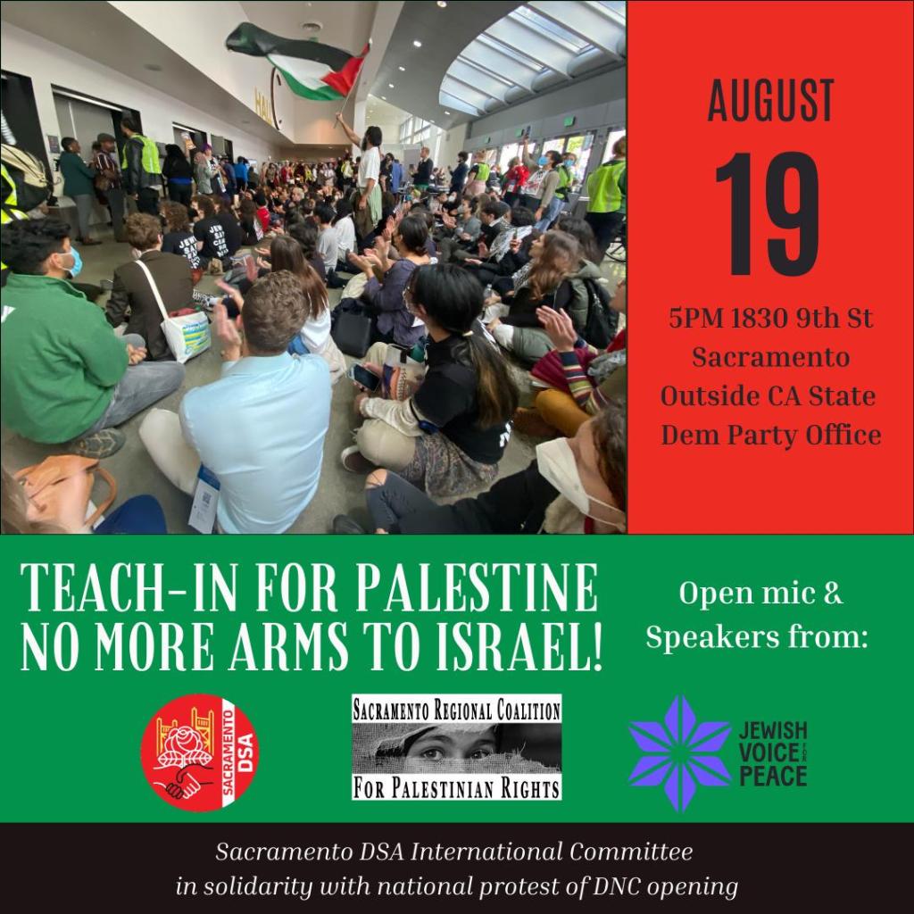 In a solidarity action with protests on the opening day of the Democratic National Convention in Chicago, Sacramento DSA is leading a teach-in outside the offices of the state party, 1830 9th St. (at S St.), on Monday, Aug. 19, 2024, 5-7 p.m. Speakers from various local groups will offer educational talks about Palestine, Gaza and U.S. administration/congressional complicity in Israeli war crimes. There will be open mic opportunity. It’s also part of a nationwide wave of actions titled “Not Another Bomb,” calling for an arms embargo.